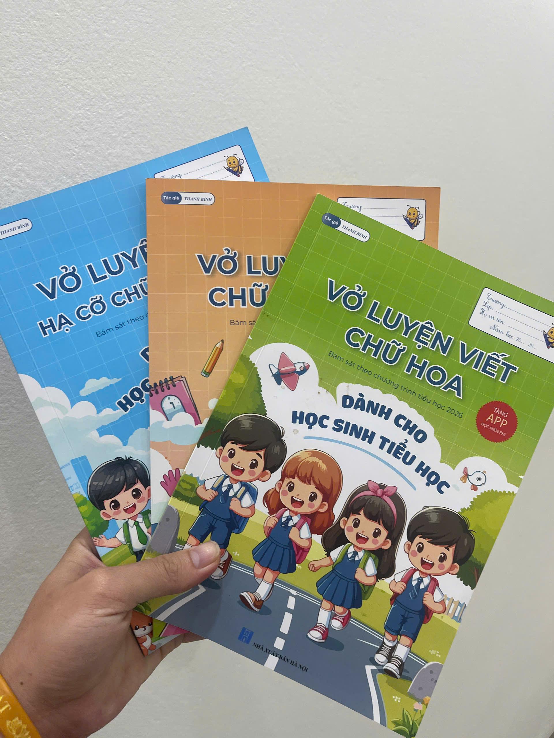 Bộ 3 quyển sách trong hình là bộ vở luyện viết dành cho học sinh tiểu học, được thiết kế sinh động, nhiều màu sắc, phù hợp với các em nhỏ trong giai đoạn đầu rèn chữ. Bộ sách gồm: